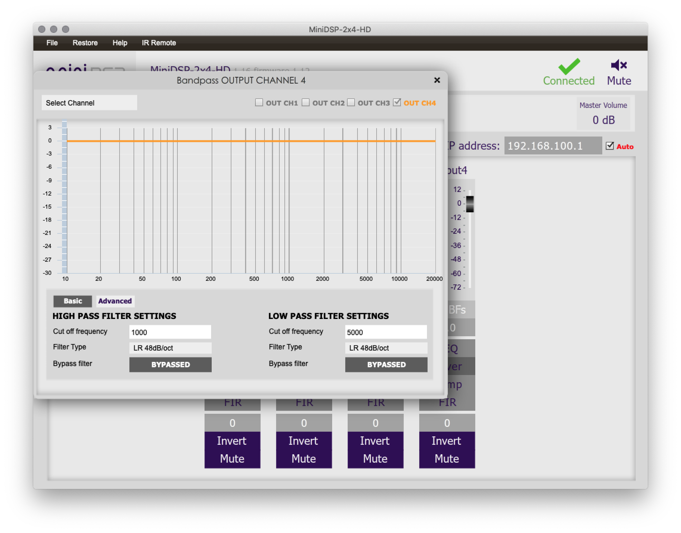 First, I'm going to take a measurement of the "Right" location (no EQ). I have four subwoofers connected, so I'm just going to enable the one output from the MiniDSP and disable the rest - that way I'm just measuring the subwoofer location of interest: