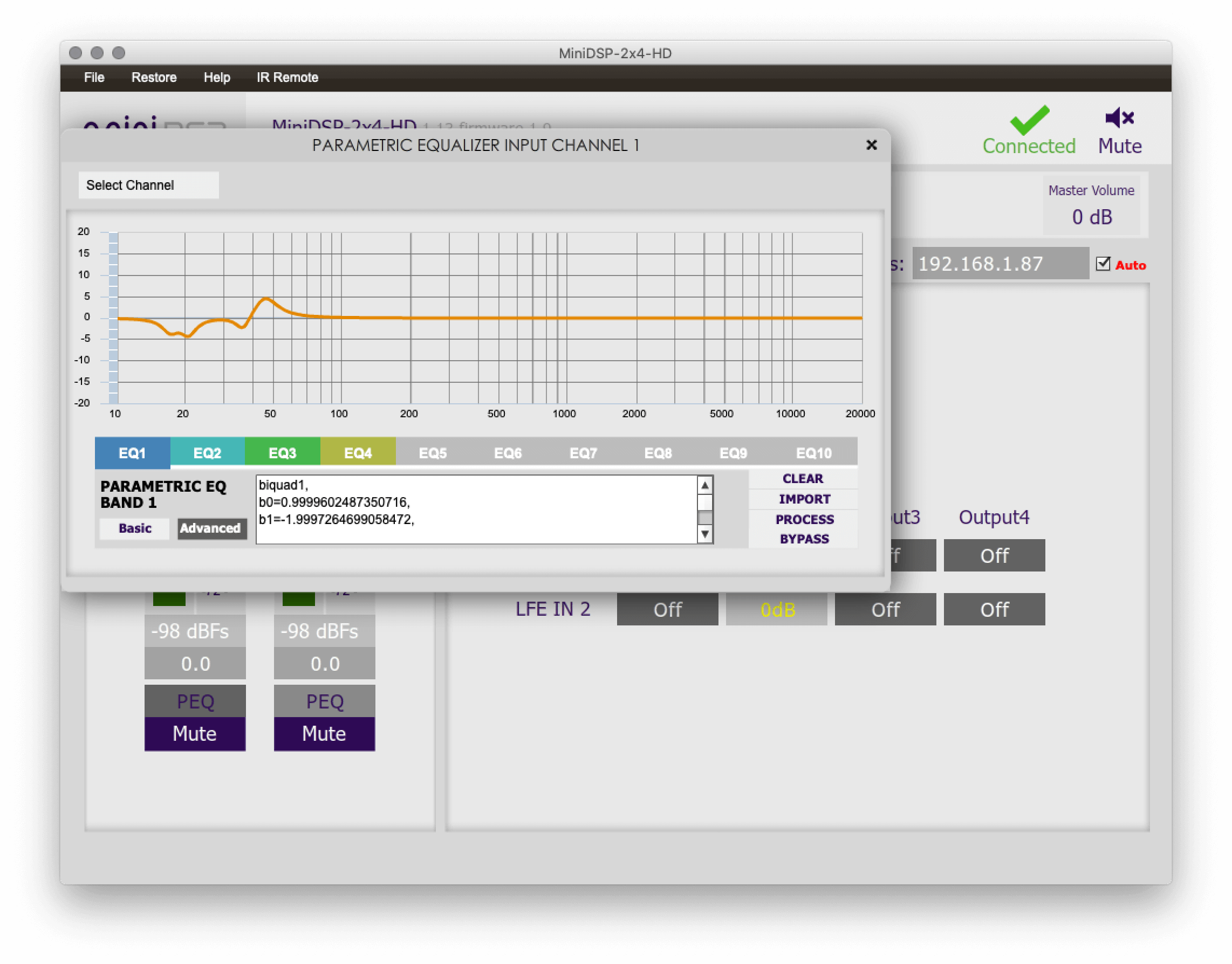 We're now ready to import our filter coefficients into miniDSP. So load up the MiniDSP software. I'm using the wifi adapter to make things faster. I highly recommend this addition. Confirm the computer and miniDSP are connected and synchronized.