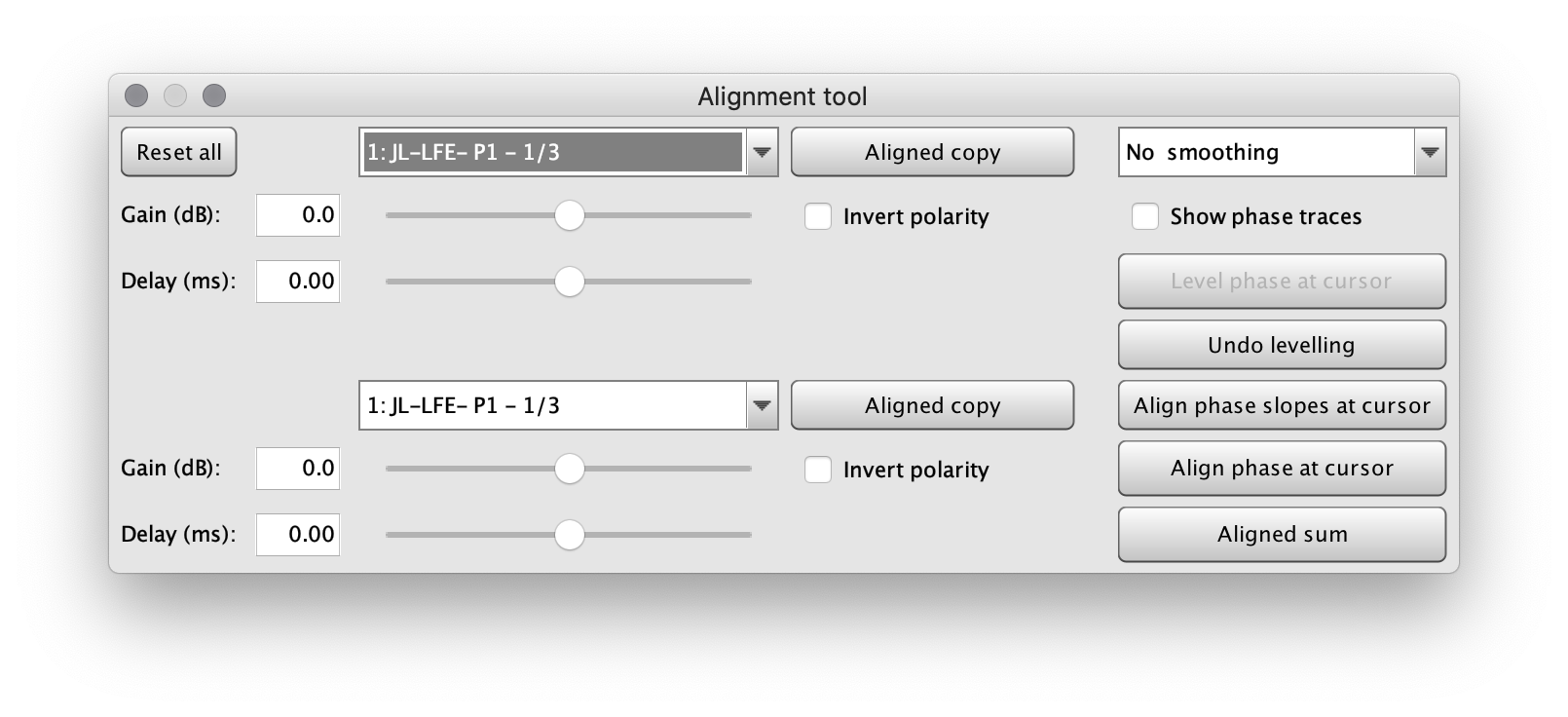 When the Alignment Tool window appears, you'll see the ability to select two different measurements (it will default both selections to the first measurement in your list). Below each measurement selection you'll see a Gain, Delay and Polarity setting.
