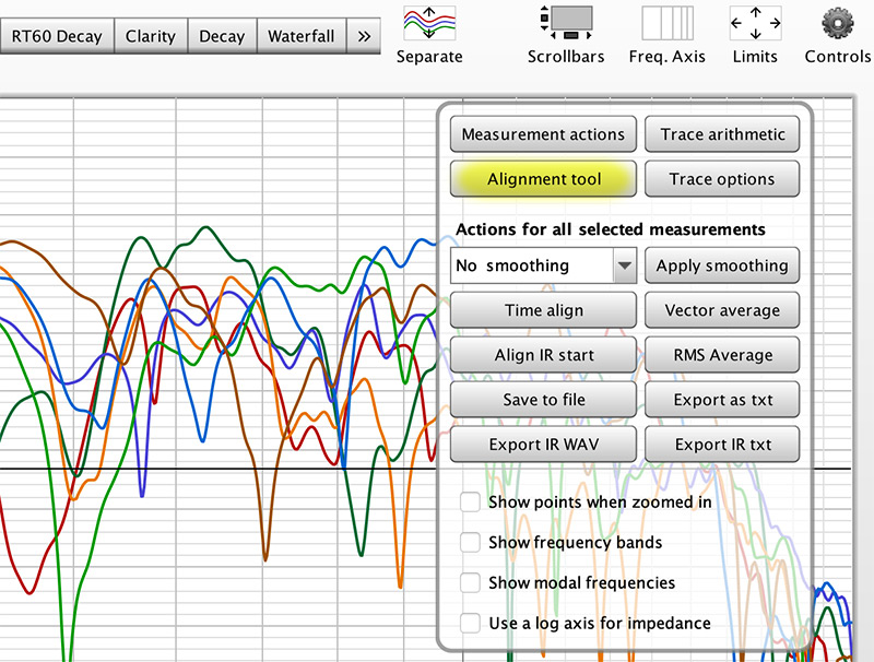 Next we want to sum the various combinations to see which gives us the most even response. For a basic summation, we can use the Trace Arithmetic tool, but we also want to add delays and adjust the gain, so we'll be using REW's Alignment Tool. Make sure each individual measurement is loaded, but it does not matter which is selected as the tool will allow us to choose within it.